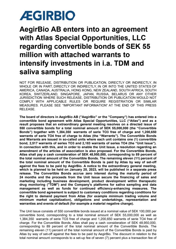 The board of directors in AegirBio AB (”AegirBio” or the ”Company”) has entered into a convertible bond agreement with Atlas Special Opportunities, LLC (“Atlas”) and as a result proposes that an extraordinary general meeting resolves on a directed issue of 550 convertible bonds for a total nominal amount of SEK 55,000,000 (the “Convertible Bonds”) together with 1,384,350 warrants of serie TO3 free of charge and 1,200,650 warrants of serie TO4 free of charge to Atlas (the “Warrants”). The Convertible Bonds and Warrants are issued in so-called units where each unit contains one (1) convertible bond, 2,517 warrants of series TO3 and 2,183 warrants of series TO4 (the “Unit Issue”). In connection with this, and in order to enable the Unit Issue, a resolution regarding an amendment of the articles of association is also proposed. For the Convertible Bonds, Atlas shall pay a cash consideration of SEK 48,950,000, corresponding to 89 percent of the total nominal amount of the Convertible Bonds. The remaining eleven (11) percent of the total nominal amount of the Convertible Bonds is paid by Atlas by way of set-off against the fees to be paid by AegirBio. A notice to the extraordinary general meeting, which is planned to be held on January 20, 2023, will be published in a separate press release. The Convertible Bonds accrue zero interest during the maturity period of 24 months and the proceeds from the Unit Issue secure the financing of sales and marketing including business development, product development within therapeutic drug monitoring (“TDM”) and the Company’s platforms for saliva sampling and data management as well as funds for continued efficiency-enhancing measures. The convertible bond agreement is subject to customary conditions regarding conditions for the right to demand payment from Atlas (for example minimum trading volume and minimum market capitalization), obligations and undertakings, representation and warranties and events of default (for example a material negative change).