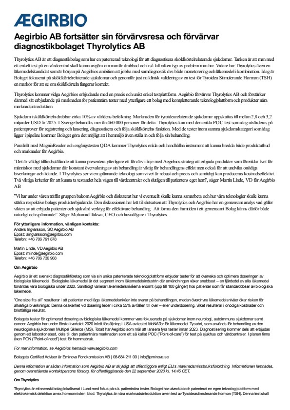 Thyrolytics kommer vidga Aegirbios erbjudande med en precis och unikt enkel testplattform. Aegirbio förvärvar Thyrolytics AB och förstärker därmed sitt erbjudande på marknaden för patientnära tester med ytterligare ett bolag med kompletterande teknologiplattform och produkter nära marknadsintroduktion.