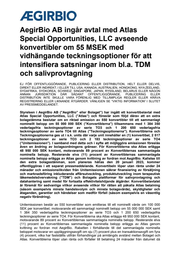 Styrelsen i AegirBio AB (”AegirBio” eller Bolaget”) har ingått ett konvertibelavtal med Atlas Special Opportunities, LLC (”Atlas”) och föreslår som följd därav att en extra bolagstämma beslutar om en riktad emission av 550 konvertibler till ett sammanlagt nominellt belopp om 55 000 000 SEK (”Konvertiblerna”) tillsammans med 1 384 350 vederlagsfria teckningsoptioner av serie TO3 och 1 200 650 vederlagsfria teckningsoptioner av serie TO4 till Atlas (”Teckningsoptionerna”). Konvertiblerna och Teckningsoptionerna ges ut i s.k. units där varje unit innehåller en (1) konvertibel, 2 517 teckningsoptioner av serie TO3 och 2 183 teckningsoptioner av serie TO4 (”Unitemissionen”). I samband med detta och i syfte att möjliggöra emissionen föreslås även en ändring av bolagsordningens gränser. För Konvertiblerna ska Atlas erlägga 48 950 000 SEK kontant, motsvarande 89 procent av Konvertiblernas sammanlagda nominella belopp. Resterande elva (11) procent av Konvertiblernas sammanlagda nominella belopp erläggs av Atlas genom kvittning av fordran mot AegirBio. Kallelse till den extra bolagsstämman, som planeras hållas den 20 januari 2023, kommer offentliggöras i ett separat pressmeddelande. Konvertibeln löper utan ränta under 24 månader och emissionslikviden från Unitemissionen säkrar finansiering av försäljning och marknadsföring inkluderande affärsutveckling, produktutveckling inom terapeutisk läkemedelsövervakning (”TDM”) och Bolagets plattformar för salivprovtagning och datahantering samt medel för fortsatta effektivitetshöjande åtgärder. Konvertibelavtalet är föremål för sedvanliga villkor avseende villkor för rätten att påkalla Atlas betalning (såsom exempelvis minsta handelsvolym och minsta bolagsvärde), skyldigheter och åtaganden, garantier och händelser som medför förfall (såsom exempelvis en väsentlig negativ förändring).