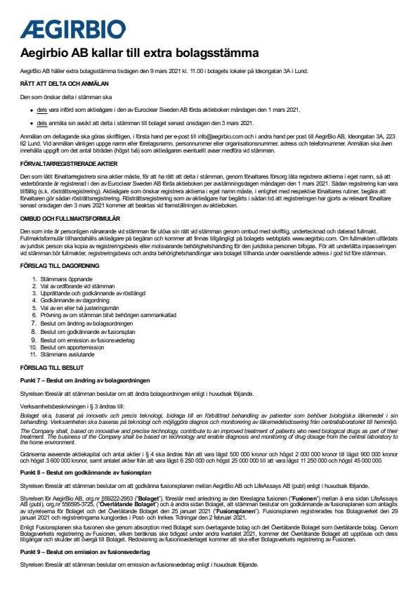 Styrelsen för AegirBio AB, org.nr 559222-2953 (”Bolaget”), föreslår med anledning av den föreslagna fusionen (”Fusionen”) mellan å ena sidan LifeAssays AB (publ), org.nr 556595-3725, (”Överlåtande Bolaget”) och å andra sidan Bolaget, att stämman beslutar om godkännande av fusionsplanen som antagits av styrelserna för Bolaget och det Överlåtande Bolaget den 25 januari 2021 (”Fusionsplanen”). Fusionsplanen registrerades hos Bolagsverket den 29 januari 2021 och registreringarna kungjordes i Post- och Inrikes Tidningar den 2 februari 2021.