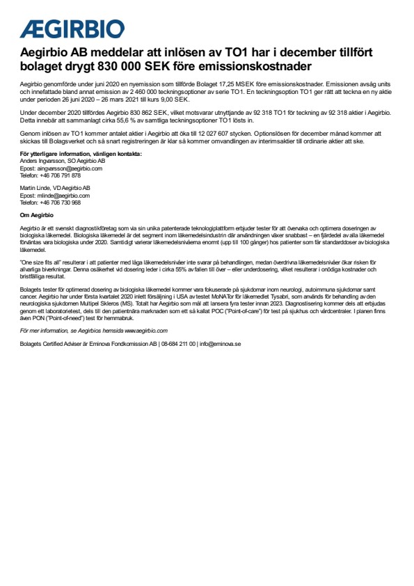 Under december 2020 tillfördes Aegirbio 830 862 SEK, vilket motsvarar utnyttjande av 92 318 TO1 för teckning av 92 318 aktier i Aegirbio. Detta innebär att sammanlagt cirka 55,6 % av samtliga teckningsoptioner TO1 lösts in.