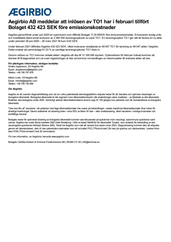 Under februari 2021 tillfördes Aegirbio 432 423 SEK, vilket motsvarar utnyttjande av 48 047 TO1 för teckning av 48 047 aktier i Aegirbio. Detta innebär att sammanlagt 61,33 % av samtliga teckningsoptioner TO1 lösts in.