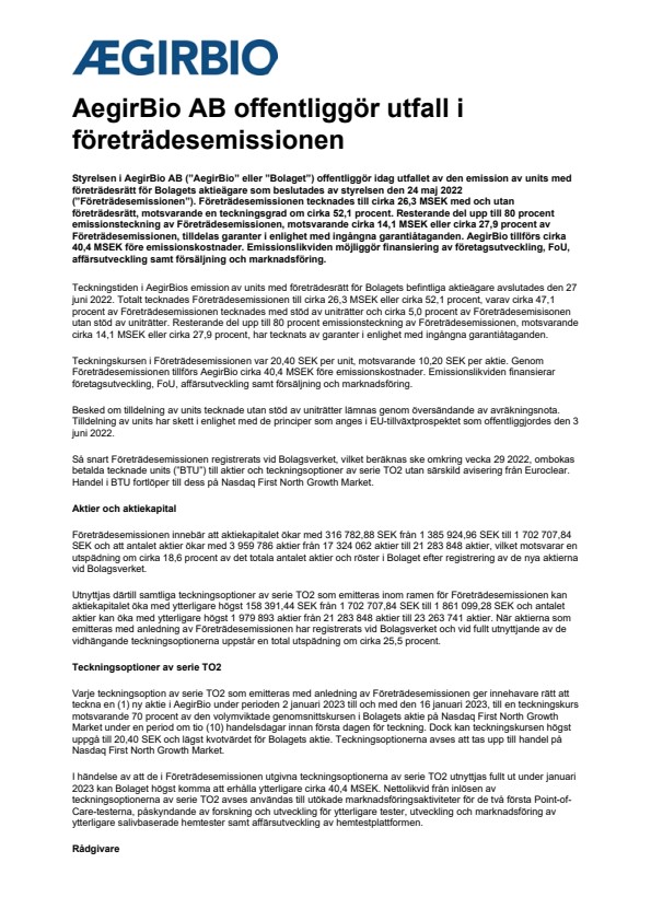 Styrelsen i AegirBio AB (”AegirBio” eller ”Bolaget”) offentliggör idag utfallet av den emission av units med företrädesrätt för Bolagets aktieägare som beslutades av styrelsen den 24 maj 2022 (”Företrädesemissionen”). Företrädesemissionen tecknades till cirka 26,3 MSEK med och utan företrädesrätt, motsvarande en teckningsgrad om cirka 52,1 procent. Resterande del upp till 80 procent emissionsteckning av Företrädesemissionen, motsvarande cirka 14,1 MSEK eller cirka 27,9 procent av Företrädesemissionen, tilldelas garanter i enlighet med ingångna garantiåtaganden. AegirBio tillförs cirka 40,4 MSEK före emissionskostnader. Emissionslikviden möjliggör finansiering av företagsutveckling, FoU, affärsutveckling samt försäljning och marknadsföring.