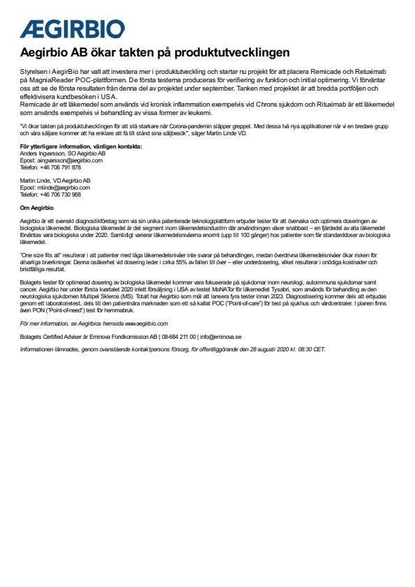 Styrelsen i AegirBio har valt att investera mer i produktutveckling och startar nu projekt för att placera Remicade och Retuximab på MagniaReader POC-plattformen. De första testerna produceras för verifiering av funktion och initial optimering. Vi förväntar oss att se de första resultaten från denna del av projektet under september. Tanken med projektet är att bredda portföljen och effektivisera kundbesöken i USA.
