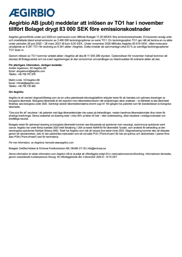 Aegirbio genomförde under juni 2020 en nyemission som tillförde Bolaget 17,25 MSEK före emissionskostnader. Emissionen avsåg units och innefattade bland annat emission av 2 460 000 teckningsoptioner av serie TO1. En teckningsoption TO1 ger rätt att teckna en ny aktie under perioden 26 juni 2020 – 26 mars 2021 till kurs 9,00 SEK. Under november 2020 tillfördes Aegirbio 83 619 SEK, vilket motsvarar utnyttjande av 9 291 TO1 för teckning av 9 291 aktier i Aegirbio. Detta innebär att sammanlagt cirka 53 % av samtliga teckningsoptioner TO1 lösts in.