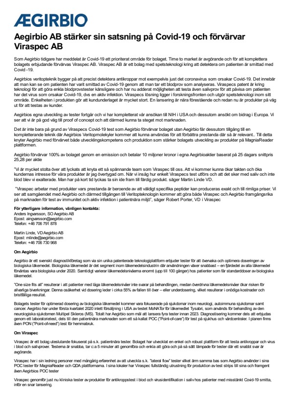 ”Viraspec arbetar med produkter vars prestanda är beroende av att väldigt specifika peptider kan produceras exakt och till rimliga priser. Vi ser att samgåendet med Aegirbio och därmed tillgången till Veritopteknologin kommer att göra både Viraspec och Aegirbio framgångsrika på marknaden för test av immunitet och aktiv infektion i patientnära miljö”, säger Robert Porter, VD i Viraspec