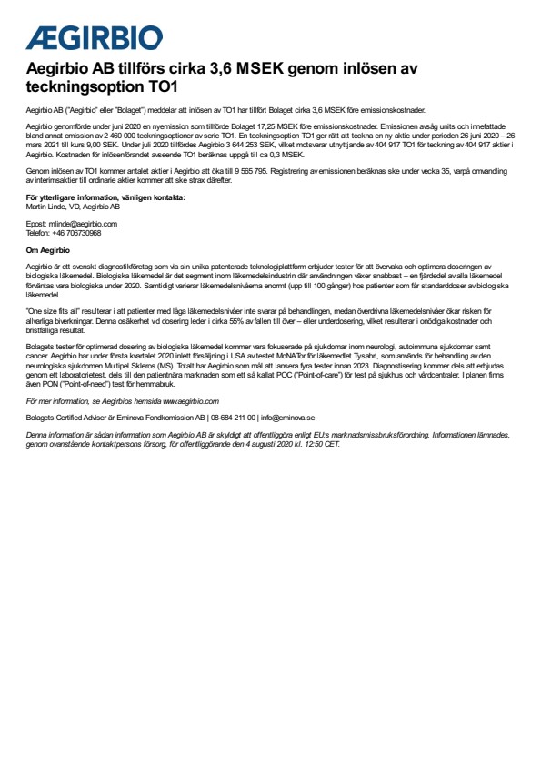 Aegirbio genomförde under juni 2020 en nyemission som tillförde Bolaget 17,25 MSEK före emissionskostnader. Emissionen avsåg units och innefattade bland annat emission av 2 460 000 teckningsoptioner av serie TO1. En teckningsoption TO1 ger rätt att teckna en ny aktie under perioden 26 juni 2020 – 26 mars 2021 till kurs 9,00 SEK. Under juli 2020 tillfördes Aegirbio 3 644 253 SEK, vilket motsvarar utnyttjande av 404 917 TO1 för teckning av 404 917 aktier i Aegirbio. Kostnaden för inlösenförandet avseende TO1 beräknas uppgå till ca 0,3 MSEK.