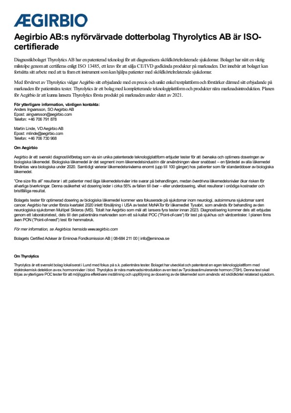 Med förvärvet av Thyrolytics vidgar Aegirbio sitt erbjudande med en precis och unikt enkel testplattform och förstärker därmed sitt erbjudande på marknaden för patientnära tester. Thyrolytics är ett bolag med kompletterande teknologiplattform och produkter nära marknadsintroduktion. Planen för Aegirbio är att kunna lansera Thyrolytics första produkt på marknaden under slutet av 2021.