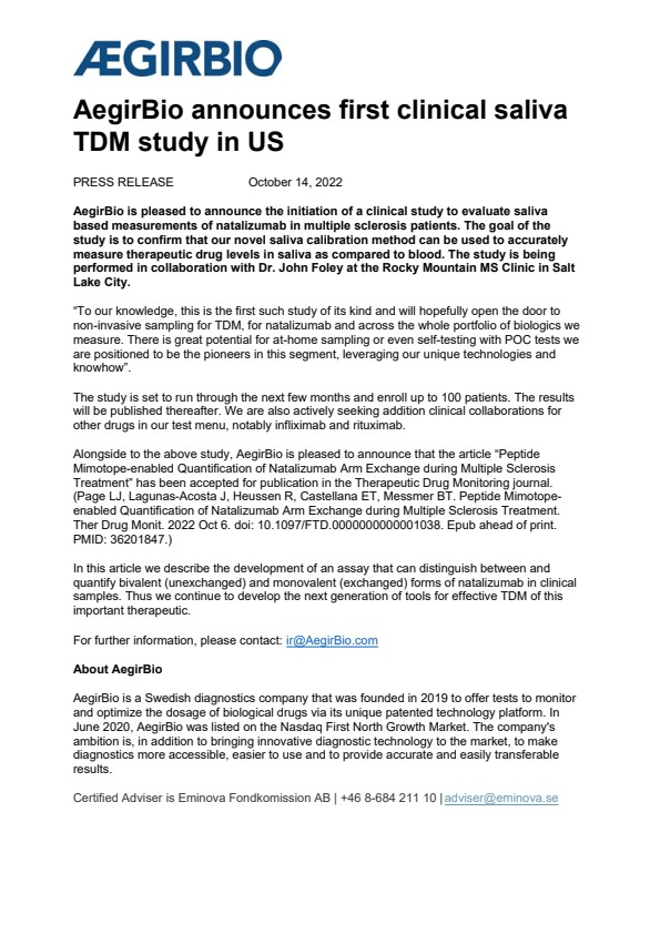 Alongside to the above study, AegirBio is pleased to announce that the article “Peptide Mimotope-enabled Quantification of Natalizumab Arm Exchange during Multiple Sclerosis Treatment” has been accepted for publication in the Therapeutic Drug Monitoring journal. (Page LJ, Lagunas-Acosta J, Heussen R, Castellana ET, Messmer BT. Peptide Mimotope-enabled Quantification of Natalizumab Arm Exchange during Multiple Sclerosis Treatment. Ther Drug Monit. 2022 Oct 6. doi: 10.1097/FTD.0000000000001038. Epub ahead of print. PMID: 36201847.)