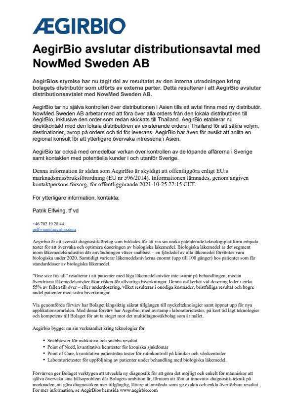 AegirBios styrelse har nu tagit del av resultatet av den interna utredningen kring bolagets distributör som utförts av externa parter. Detta resulterar i att AegirBio avslutar distributionsavtalet med NowMed Sweden AB.