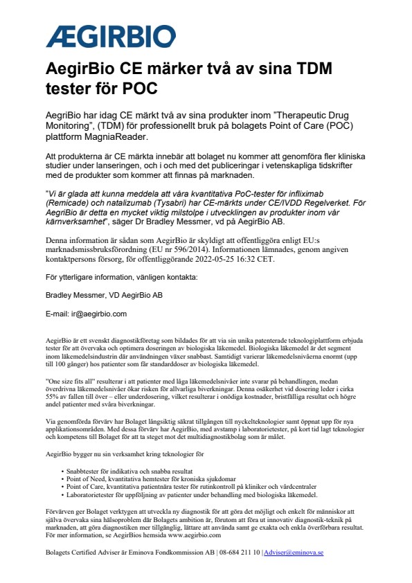 Denna information är sådan som AegirBio är skyldigt att offentliggöra enligt EU:s marknadsmissbruksförordning (EU nr 596/2014). Informationen lämnades, genom angiven kontaktpersons försorg, för offentliggörande 2022-05-25 16:32 CET.