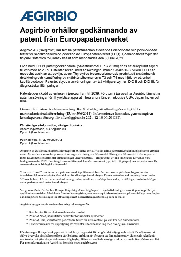 Denna information är sådan som AegirBio är skyldigt att offentliggöra enligt EU:s marknadsmissbruksförordning (EU nr 596/2014). Informationen lämnades, genom angiven kontaktpersons försorg, för offentliggörande 2021-12-10 09:20 CET.