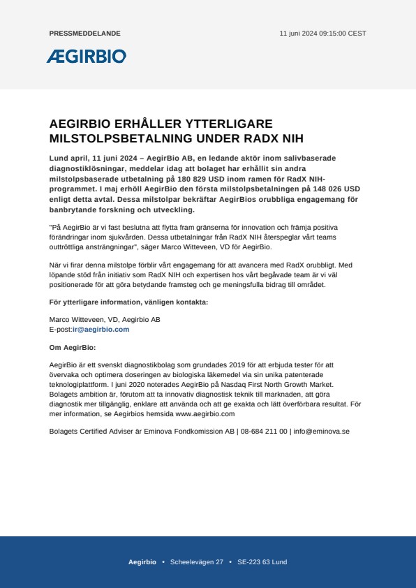 Lund april, 11 juni 2024 – AegirBio AB, en ledande aktör inom salivbaserade diagnostiklösningar, meddelar idag att bolaget har erhållit sin andra milstolpsbaserade utbetalning på 180 829 USD inom ramen för RadX NIH-programmet. I maj erhöll AegirBio den första milstolpsbetalningen på 148 026 USD enligt detta avtal. Dessa milstolpar bekräftar AegirBios orubbliga engagemang för banbrytande forskning och utveckling.