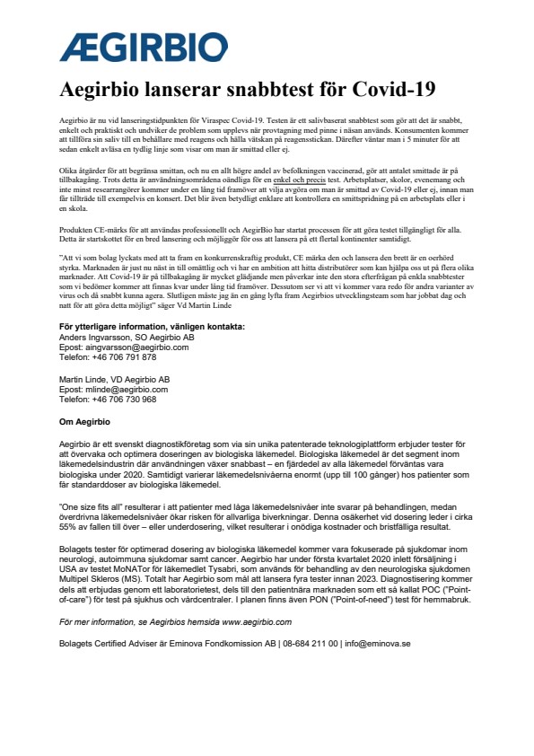 ”Att vi som bolag lyckats med att ta fram en konkurrenskraftig produkt, CE märka den och lansera den brett är en oerhörd styrka. Marknaden är just nu näst in till omättlig och vi har en ambition att hitta distributörer som kan hjälpa oss ut på flera olika marknader. Att Covid-19 är på tillbakagång är mycket glädjande men påverkar inte den stora efterfrågan på enkla snabbtester som vi bedömer kommer att finnas kvar under lång tid framöver. Dessutom ser vi att vi kommer vara redo för andra varianter av virus och då snabbt kunna agera. Slutligen måste jag än en gång lyfta fram Aegirbios utvecklingsteam som har jobbat dag och natt för att göra detta möjligt” säger Vd Martin Linde