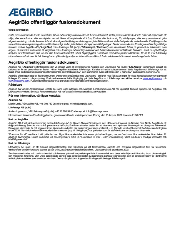 AegirBio offentliggör idag ett fusionsdokument avseende samgåendet med LifeAssays i enlighet med Takeover-regler för vissa handelsplattformar utgivna av Kollegiet för svensk bolagsstyrning. Fusionsdokumentet hålls tillgängligt på både AegirBios och LifeAssays respektive hemsidor, www.aegirbio.com och www.lifeassays.com. Fusionsdokumentet har inte granskats eller godkänts av Finansinspektionen.