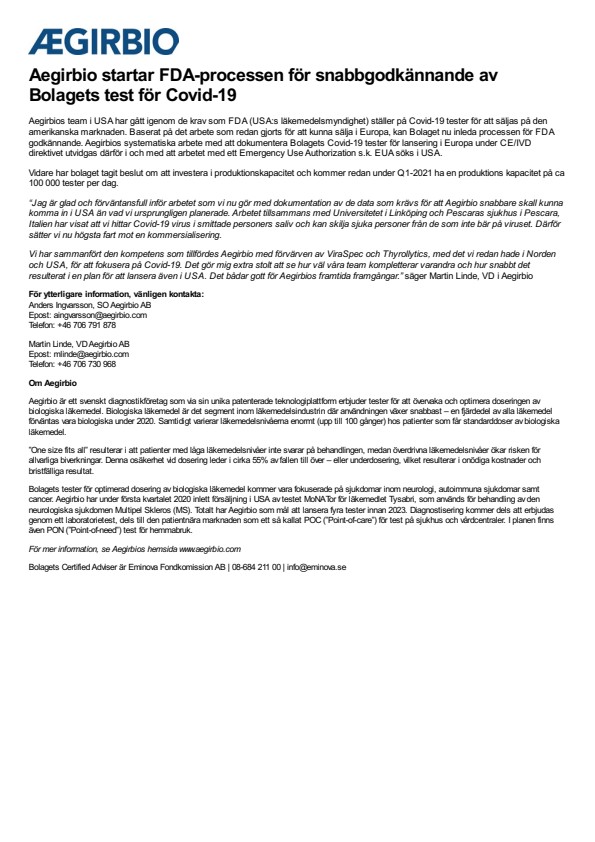 Aegirbios team i USA har gått igenom de krav som FDA (USA:s läkemedelsmyndighet) ställer på Covid-19 tester för att säljas på den amerikanska marknaden. Baserat på det arbete som redan gjorts för att kunna sälja i Europa, kan Bolaget nu inleda processen för FDA godkännande. Aegirbios systematiska arbete med att dokumentera Bolagets Covid-19 tester för lansering i Europa under CE/IVD direktivet utvidgas därför i och med att arbetet med ett Emergency Use Authorization s.k. EUA söks i USA.