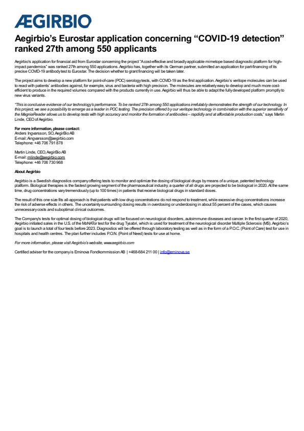 Aegirbio’s application for financial aid from Eurostar concerning the project “A cost-effective and broadly applicable mimetope based diagnostic platform for high-impact pandemics” was ranked 27th among 550 applications. Aegirbio has, together with its German partner, submitted an application for part-financing of its precise COVID-19 antibody test to Eurostar. The decision whether to grant financing will be taken later.