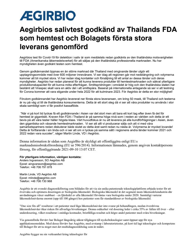 Denna information är sådan som AegirBio är skyldigt att offentliggöra enligt EU:s marknadsmissbruksförordning (EU nr 596/2014). Informationen lämnades, genom angiven kontaktpersons försorg, för offentliggörande 2021-09-10 13:07 CET.