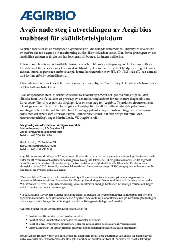 ” Det är spännande tider, vi närmar oss slutet av utvecklingsarbetet och gör oss redo att gå in i den kliniska fasen. Att få validera en prototyp av den unika testplattform för patientnära diagnostik som förvärvet av Thyrolytics gav oss tillgång till, är ett stort steg för Aegirbio. Thyrolytics elektrokemiska teknologi kommer när den är klar att göra det möjligt för oss att fortsätta att utveckla patientnära vårddiagnostik och därmed förbättra livet för många patienter. Jag vill också tillägga att vi är mycket nöjda med det arbete som utförs av Sigma Connectivity-teamet, allt från design till mjuk- och hårdvaruutveckling”, säger Martin Linde, VD Aegirbio AB.