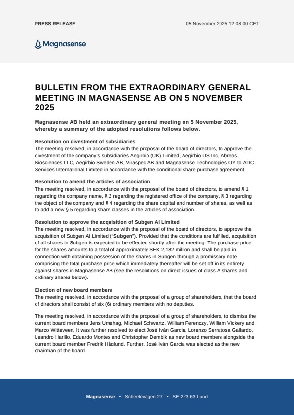 Magnasense AB held an extraordinary general meeting on 5 November 2025, whereby a summary of the adopted resolutions follows below.