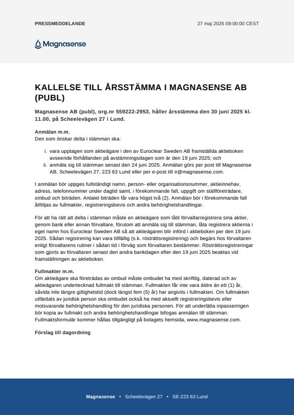 Magnasense AB (publ), org.nr 559222-2953, håller årsstämma den 30 juni 2025 kl. 11.00, på Scheelevägen 27 i Lund.
