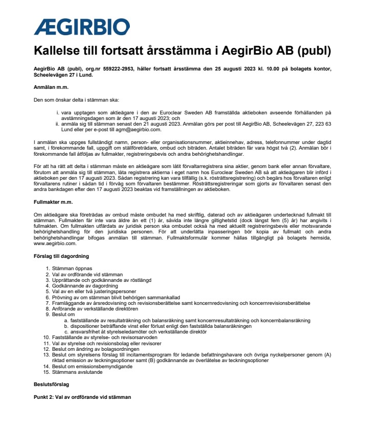 AegirBio AB (publ), org.nr 559222-2953, håller fortsatt årsstämma den 25 augusti 2023 kl. 10.00 på bolagets kontor, Scheelevägen 27 i Lund.