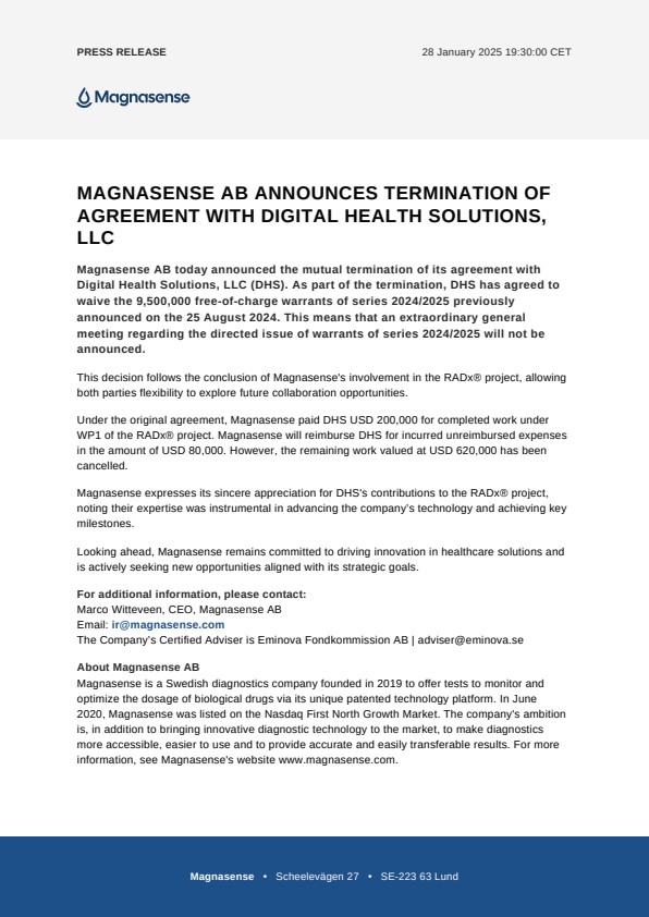 Magnasense AB today announced the mutual termination of its agreement with Digital Health Solutions, LLC (DHS). As part of the termination, DHS has agreed to waive the 9,500,000 free-of-charge warrants of series 2024/2025 previously announced on the 25 August 2024. This means that an extraordinary general meeting regarding the directed issue of warrants of series 2024/2025 will not be announced.