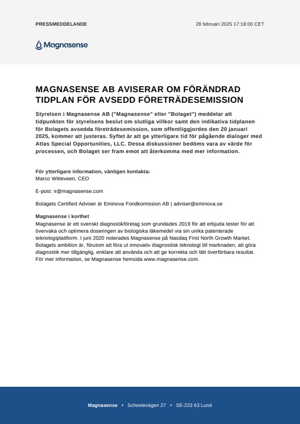Styrelsen i Magnasense AB (“Magnasense” eller “Bolaget”) meddelar att tidpunkten för styrelsens beslut om slutliga villkor samt den indikativa tidplanen för Bolagets avsedda företrädesemission, som offentliggjordes den 20 januari 2025, kommer att justeras. Syftet är att ge ytterligare tid för pågående dialoger med Atlas Special Opportunities, LLC. Dessa diskussioner bedöms vara av värde för processen, och Bolaget ser fram emot att återkomma med mer information.