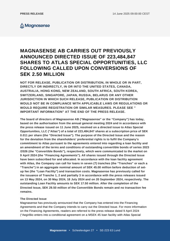 The board of directors of Magnasense AB (“Magnasense” or the “Company”) has today, based on the authorisation from the annual general meeting 2024 and in accordance with the press release issued on 11 June 2025, resolved on a directed issue to Atlas Special Opportunities, LLC (“Atlas”) of a total of 223,484,847 shares at a subscription price of SEK 0.011 per share (the “Directed Issue”). The purpose of the Directed Issue and the reason for the deviation from the shareholders’ preferential rights is to fulfil the Company’s commitment to Atlas pursuant to the agreements entered into regarding a loan facility and an amendment of the terms and conditions of outstanding convertible bonds of series 2023/2026 (the “Convertible Bonds”), respectively, which were communicated to the market on 9 April 2024 (the “Financing Agreements”). All shares issued through the Directed Issue have been subscribed for and allocated. In accordance with the loan facility agreement with Atlas, the Company can call for loans in seven (7) tranches (the “Tranches” or each a “Tranche”) in an aggregate nominal amount of SEK 45.00 million before deduction of set-up fee (the “Loan Facility”) and transaction costs. Magnasense has previously called for the issuance of Tranche 1, 2 and partially 3 in accordance with the press releases issued on 13 May 2024, on 30 May 2024, 18 July 2024 and on 20 September 2024, respectively. The outstanding Loan Facility amounts to SEK 17.50 million. After the completion of the Directed Issue, SEK 29.50 million of the Convertible Bonds remain and no transaction fee remains.
