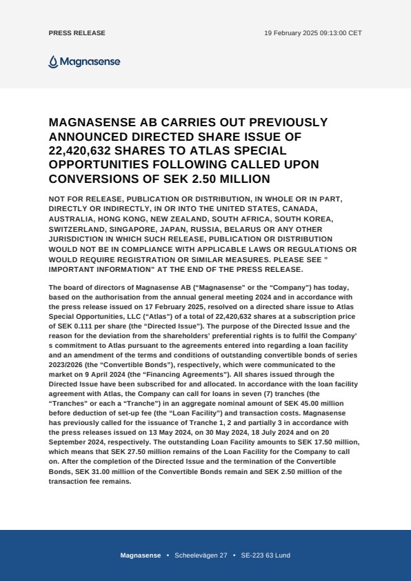 The board of directors of Magnasense AB (“Magnasense” or the “Company”) has today, based on the authorisation from the annual general meeting 2024 and in accordance with the press release issued on 17 February 2025, resolved on a directed share issue to Atlas Special Opportunities, LLC (“Atlas”) of a total of 22,420,632 shares at a subscription price of SEK 0.111 per share (the “Directed Issue”). The purpose of the Directed Issue and the reason for the deviation from the shareholders’ preferential rights is to fulfil the Company’s commitment to Atlas pursuant to the agreements entered into regarding a loan facility and an amendment of the terms and conditions of outstanding convertible bonds of series 2023/2026 (the “Convertible Bonds”), respectively, which were communicated to the market on 9 April 2024 (the “Financing Agreements”). All shares issued through the Directed Issue have been subscribed for and allocated. In accordance with the loan facility agreement with Atlas, the Company can call for loans in seven (7) tranches (the “Tranches” or each a “Tranche”) in an aggregate nominal amount of SEK 45.00 million before deduction of set-up fee (the “Loan Facility”) and transaction costs. Magnasense has previously called for the issuance of Tranche 1, 2 and partially 3 in accordance with the press releases issued on 13 May 2024, on 30 May 2024, 18 July 2024 and on 20 September 2024, respectively. The outstanding Loan Facility amounts to SEK 17.50 million, which means that SEK 27.50 million remains of the Loan Facility for the Company to call on. After the completion of the Directed Issue and the termination of the Convertible Bonds, SEK 31.00 million of the Convertible Bonds remain and SEK 2.50 million of the transaction fee remains.