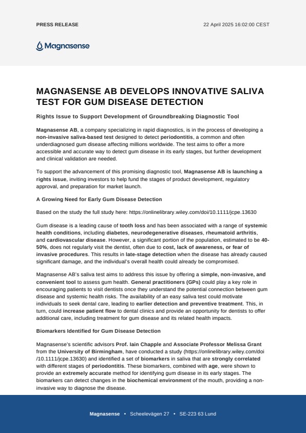 “This is a very exciting time for Magnasense AB. We have the opportunity to revolutionize the way gum disease is detected, but we need additional investment to move forward with product development and bring this technology to market,” said Marco Witteveen, CEO of Magnasense AB. “With this rights issue, we’re inviting investors to join us on the ground floor of what we believe could be a game-changing diagnostic tool in a significant and growing healthcare market.”