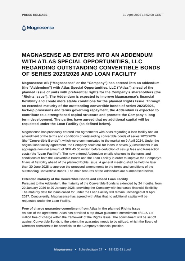 Magnasense has previously entered into agreements with Atlas regarding a loan facility and an amendment of the terms and conditions of outstanding convertible bonds of series 2023/2026 (the “Convertible Bonds“), which were communicated to the market on 9 April 2024. Under the original loan facility agreement, the Company could call for loans in seven (7) instalments in an aggregate nominal amount of SEK 45.00 million before deduction of set-up fees and transaction costs (the “Loan Facility“). The now entered Addendum entails changes to the terms and conditions of both the Convertible Bonds and the Loan Facility in order to improve the Company’s financial flexibility ahead of the planned Rights Issue. A general meeting shall be held no later than 30 June 2025 to approve the proposed amendments to the terms and conditions of the outstanding Convertible Bonds. The main features of the Addendum are summarised below.