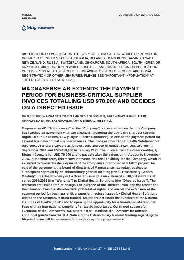 Magnasense AB (“Magnasense” or the “Company”) today announces that the Company has reached an agreement with two creditors, including the Company’s largest supplier Digital Health Solutions, LLC (“Digital Health Solutions”), to extend the payment period for several business critical supplier invoices. The invoices from Digital Health Solutions total USD 900,000 and are payable as follows: USD 100,000 in August 2024, USD 350,000 in September 2024 and USD 450,000 in January 2025. The invoice from the other creditor, Q Biotech Corp., is for USD 70,000 and is payable after the extension in August to November 2024. In the short term, this means increased financial flexibility for the Company, which is expected to favour the development of the Company’s grant-funded RADx® project. As part of the agreement, the board of directors of Magnasense has today, subject to subsequent approval by an extraordinary general meeting (the “Extraordinary General Meeting”), resolved to carry out a directed issue of a maximum of 9,500,000 warrants of series 2024/2025 (the “Warrants”) to Digital Health Solutions (the “Directed Issue”). The Warrants are issued free-of-charge. The purpose of the Directed Issue and the reason for the deviation from the shareholders’ preferential rights is to enable the extension of the payment period for business-critical supplier invoices issued by Digital Health Solutions related to the Company’s grant-funded RADx® project under the auspices of the National Institutes of Health (“NIH”) and to open up the opportunity for a broadened shareholder base with an international supplier of strategic importance. Continued successful execution of the Company’s RADx® project will position the Company for potential additional grants from the NIH. Notice of the Extraordinary General Meeting regarding the Directed Issue will be announced through a separate press release.