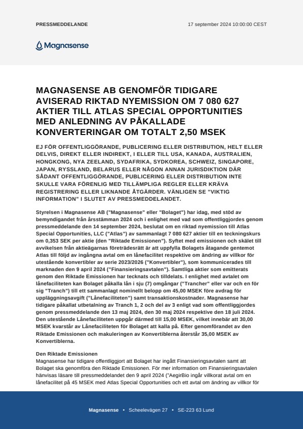 Styrelsen i Magnasense AB (”Magnasense” eller ”Bolaget”) har idag, med stöd av bemyndigandet från årsstämman 2024 och i enlighet med vad som offentliggjordes genom pressmeddelande den 14 september 2024, beslutat om en riktad nyemission till Atlas Special Opportunities, LLC (”Atlas”) av sammanlagt 7 080 627 aktier till en teckningskurs om 0,353 SEK per aktie (den ”Riktade Emissionen”). Syftet med emissionen och skälet till avvikelsen från aktieägarnas företrädesrätt är att uppfylla Bolagets åtagande gentemot Atlas till följd av ingångna avtal om en lånefacilitet respektive om ändring av villkor för utestående konvertibler av serie 2023/2026 (”Konvertibler”), som kommunicerades till marknaden den 9 april 2024 (”Finansieringsavtalen”). Samtliga aktier som emitterats genom den Riktade Emissionen har tecknats och tilldelats. I enlighet med avtalet om lånefaciliteten kan Bolaget påkalla lån i sju (7) omgångar (”Trancher” eller var och en för sig ”Tranch”) till ett sammanlagt nominellt belopp om 45,00 MSEK före avdrag för uppläggningsavgift (”Lånefaciliteten”) samt transaktionskostnader. Magnasense har tidigare påkallat utbetalning av Tranch 1, 2 och del av 3 enligt vad som offentliggjordes genom pressmeddelande den 13 maj 2024, den 30 maj 2024 respektive den 18 juli 2024. Den utestående Lånefaciliteten uppgår därmed till 15,00 MSEK, vilket innebär att 30,00 MSEK kvarstår av Lånefaciliteten för Bolaget att kalla på. Efter genomförandet av den Riktade Emissionen och makuleringen av Konvertiblerna återstår 35,00 MSEK av Konvertiblerna.