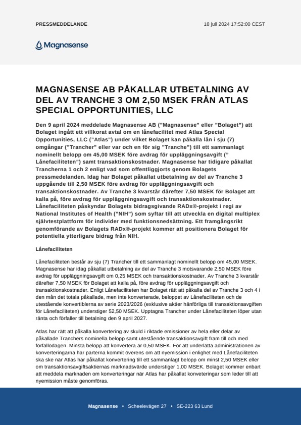 Den 9 april 2024 meddelade Magnasense AB (”Magnasense” eller ”Bolaget”) att Bolaget ingått ett villkorat avtal om en lånefacilitet med Atlas Special Opportunities, LLC (”Atlas”) under vilket Bolaget kan påkalla lån i sju (7) omgångar (”Trancher” eller var och en för sig ”Tranche”) till ett sammanlagt nominellt belopp om 45,00 MSEK före avdrag för uppläggningsavgift (”Lånefaciliteten”) samt transaktionskostnader. Magnasense har tidigare påkallat Trancherna 1 och 2 enligt vad som offentliggjorts genom Bolagets pressmedelanden. Idag har Bolaget påkallat utbetalning av del av Tranche 3 uppgående till 2,50 MSEK före avdrag för uppläggningsavgift och transaktionskostnader. Av Tranche 3 kvarstår därefter 7,50 MSEK för Bolaget att kalla på, före avdrag för uppläggningsavgift och transaktionskostnader. Lånefaciliteten påskyndar Bolagets bidragsgivande RADx®-projekt i regi av National Institutes of Health (”NIH”) som syftar till att utveckla en digital multiplex självtestplattform för individer med funktionsnedsättning. Ett framgångsrikt genomförande av Bolagets RADx®-projekt kommer att positionera Bolaget för potentiella ytterligare bidrag från NIH.