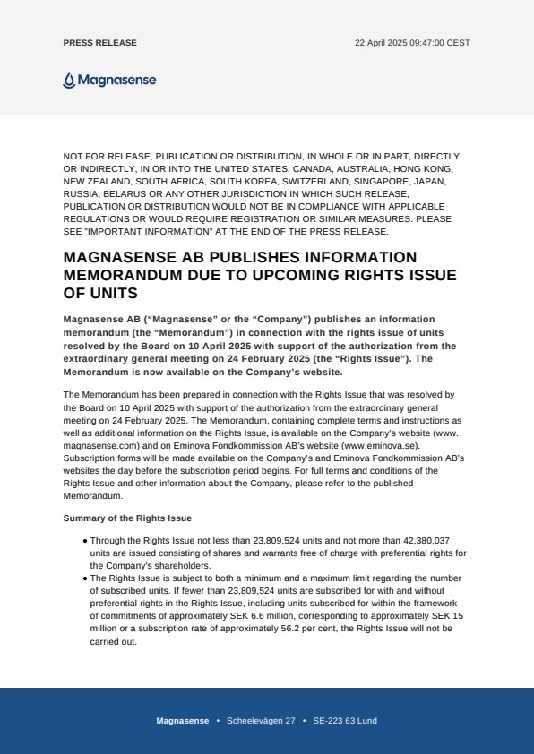 Magnasense AB (“Magnasense” or the “Company”) publishes an information memorandum (the “Memorandum”) in connection with the rights issue of units resolved by the Board on 10 April 2025 with support of the authorization from the extraordinary general meeting on 24 February 2025 (the “Rights Issue”). The Memorandum is now available on the Company’s website.