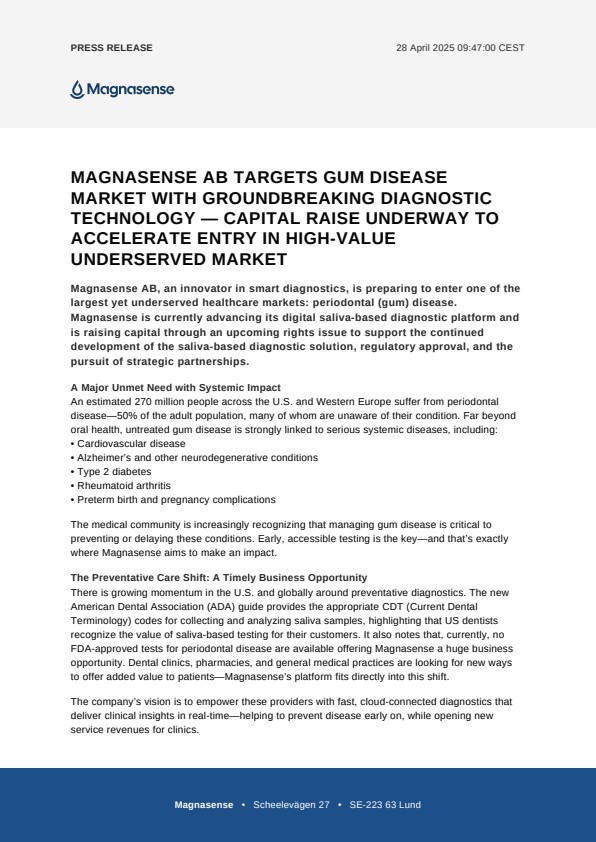 Magnasense AB, an innovator in smart diagnostics, is preparing to enter one of the largest yet underserved healthcare markets: periodontal (gum) disease. Magnasense is currently advancing its digital saliva-based diagnostic platform and is raising capital through an upcoming rights issue to support the continued development of the saliva-based diagnostic solution, regulatory approval, and the pursuit of strategic partnerships.