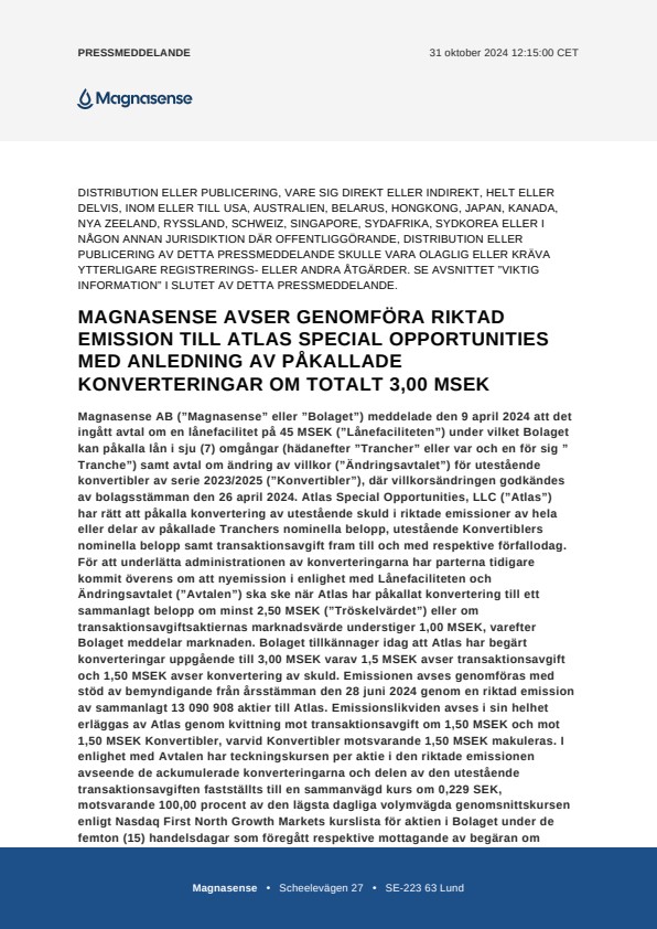 Magnasense AB (”Magnasense” eller ”Bolaget”) meddelade den 9 april 2024 att det ingått avtal om en lånefacilitet på 45 MSEK (”Lånefaciliteten”) under vilket Bolaget kan påkalla lån i sju (7) omgångar (hädanefter ”Trancher” eller var och en för sig ”Tranche”) samt avtal om ändring av villkor (”Ändringsavtalet”) för utestående konvertibler av serie 2023/2025 (”Konvertibler”), där villkorsändringen godkändes av bolagsstämman den 26 april 2024. Atlas Special Opportunities, LLC (”Atlas”) har rätt att påkalla konvertering av utestående skuld i riktade emissioner av hela eller delar av påkallade Tranchers nominella belopp, utestående Konvertiblers nominella belopp samt transaktionsavgift fram till och med respektive förfallodag. För att underlätta administrationen av konverteringarna har parterna tidigare kommit överens om att nyemission i enlighet med Lånefaciliteten och Ändringsavtalet (”Avtalen”) ska ske när Atlas har påkallat konvertering till ett sammanlagt belopp om minst 2,50 MSEK (”Tröskelvärdet”) eller om transaktionsavgiftsaktiernas marknadsvärde understiger 1,00 MSEK, varefter Bolaget meddelar marknaden. Bolaget tillkännager idag att Atlas har begärt konverteringar uppgående till 3,00 MSEK varav 1,5 MSEK avser transaktionsavgift och 1,50 MSEK avser konvertering av skuld. Emissionen avses genomföras med stöd av bemyndigande från årsstämman den 28 juni 2024 genom en riktad emission av sammanlagt 13 090 908 aktier till Atlas. Emissionslikviden avses i sin helhet erläggas av Atlas genom kvittning mot transaktionsavgift om 1,50 MSEK och mot 1,50 MSEK Konvertibler, varvid Konvertibler motsvarande 1,50 MSEK makuleras. I enlighet med Avtalen har teckningskursen per aktie i den riktade emissionen avseende de ackumulerade konverteringarna och delen av den utestående transaktionsavgiften fastställts till en sammanvägd kurs om 0,229 SEK, motsvarande 100,00 procent av den lägsta dagliga volymvägda genomsnittskursen enligt Nasdaq First North Growth Markets kurslista för aktien i Bolaget under de femton (15) handelsdagar som föregått respektive mottagande av begäran om konvertering i förhållande till storleken av respektive konverteringsbegäran. Efter genomförandet av den riktade emissionen och makuleringen av Konvertiblerna återstår 33,50 MSEK av Konvertiblerna och 2,50 MSEK av transaktionsavgiften, samt 17,50 MSEK av Lånefaciliteten.