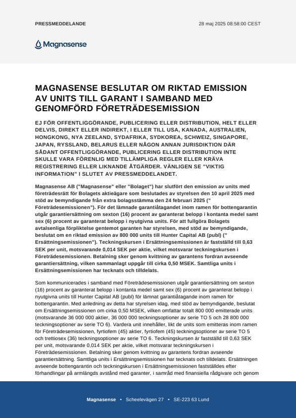 Magnasense AB (”Magnasense” eller ”Bolaget”) har slutfört den emission av units med företrädesrätt för Bolagets aktieägare som beslutades av styrelsen den 10 april 2025 med stöd av bemyndigande från extra bolagsstämma den 24 februari 2025 (”Företrädesemissionen”). För det lämnade garantiåtagandet inom ramen för bottengarantin utgår garantiersättning om sexton (16) procent av garanterat belopp i kontanta medel samt sex (6) procent av garanterat belopp i nyutgivna units. För att fullgöra Bolagets avtalsenliga förpliktelse gentemot garanten har styrelsen, med stöd av bemyndigande, beslutat om en riktad emission av 800 000 units till Hunter Capital AB (publ) (”Ersättningsemissionen”). Teckningskursen i Ersättningsemissionen är fastställd till 0,63 SEK per unit, motsvarande 0,014 SEK per aktie, vilket motsvarar teckningskursen i Företrädesemissionen. Betalning sker genom kvittning av garantens fordran avseende garantiersättning, vilken sammanlagt uppgår till cirka 0,50 MSEK. Samtliga units i Ersättningsemissionen har tecknats och tilldelats.