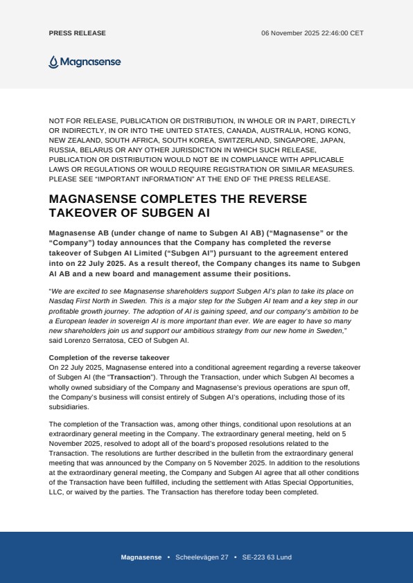 Magnasense AB (under change of name to Subgen AI AB) (“Magnasense” or the “Company”) today announces that the Company has completed the reverse takeover of Subgen AI Limited (“Subgen AI”) pursuant to the agreement entered into on 22 July 2025. As a result thereof, the Company changes its name to Subgen AI AB and a new board and management assume their positions.