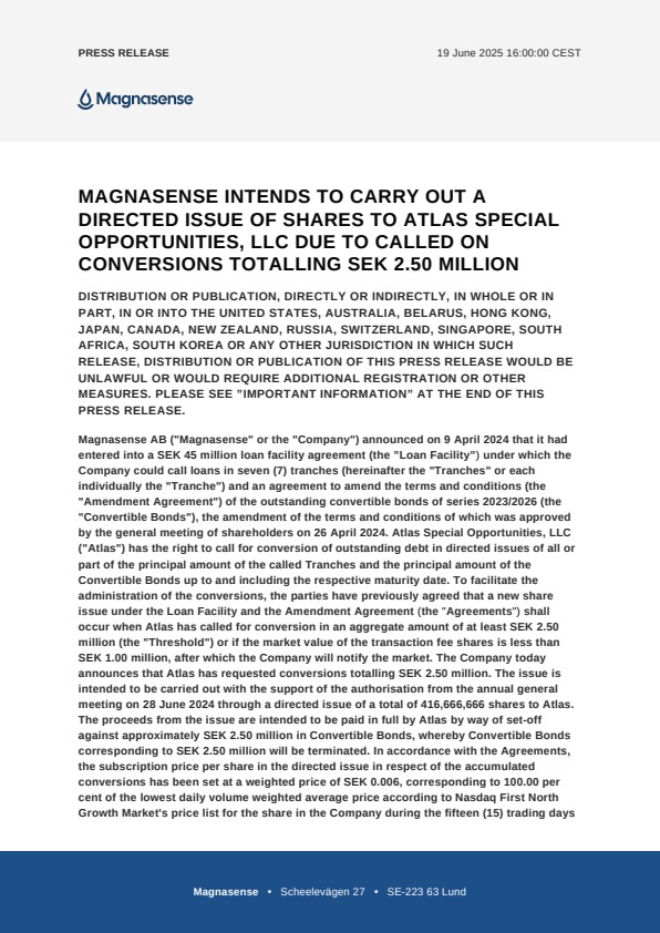 Magnasense AB (“Magnasense” or the “Company”) announced on 9 April 2024 that it had entered into a SEK 45 million loan facility agreement (the ”Loan Facility”) under which the Company could call loans in seven (7) tranches (hereinafter the “Tranches” or each individually the “Tranche”) and an agreement to amend the terms and conditions (the “Amendment Agreement”) of the outstanding convertible bonds of series 2023/2026 (the “Convertible Bonds”), the amendment of the terms and conditions of which was approved by the general meeting of shareholders on 26 April 2024. Atlas Special Opportunities, LLC (“Atlas”) has the right to call for conversion of outstanding debt in directed issues of all or part of the principal amount of the called Tranches and the principal amount of the Convertible Bonds up to and including the respective maturity date. To facilitate the administration of the conversions, the parties have previously agreed that a new share issue under the Loan Facility and the Amendment Agreement (the “Agreements“) shall occur when Atlas has called for conversion in an aggregate amount of at least SEK 2.50 million (the “Threshold”) or if the market value of the transaction fee shares is less than SEK 1.00 million, after which the Company will notify the market. The Company today announces that Atlas has requested conversions totalling SEK 2.50 million. The issue is intended to be carried out with the support of the authorisation from the annual general meeting on 28 June 2024 through a directed issue of a total of 416,666,666 shares to Atlas. The proceeds from the issue are intended to be paid in full by Atlas by way of set-off against approximately SEK 2.50 million in Convertible Bonds, whereby Convertible Bonds corresponding to SEK 2.50 million will be terminated. In accordance with the Agreements, the subscription price per share in the directed issue in respect of the accumulated conversions has been set at a weighted price of SEK 0.006, corresponding to 100.00 per cent of the lowest daily volume weighted average price according to Nasdaq First North Growth Market’s price list for the share in the Company during the fifteen (15) trading days preceding the respective receipt of the conversion request in relation to the size of the respective conversion request. After the completion of the directed issue and the termination of the Convertible Bonds, SEK 27.00 million of the Convertible Bonds remain and SEK 17.50 million of the Loan Facility remains. No transaction fee remains.