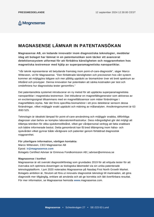 Magnasense AB, en ledande innovatör inom diagnostiska teknologier, meddelar idag att bolaget har lämnat in en patentansökan som täcker ett avancerat detektionssystem utformat för att förbättra känsligheten och noggrannheten hos magnetiska testremsor med hjälp av superparamagnetiska nanopartiklar.