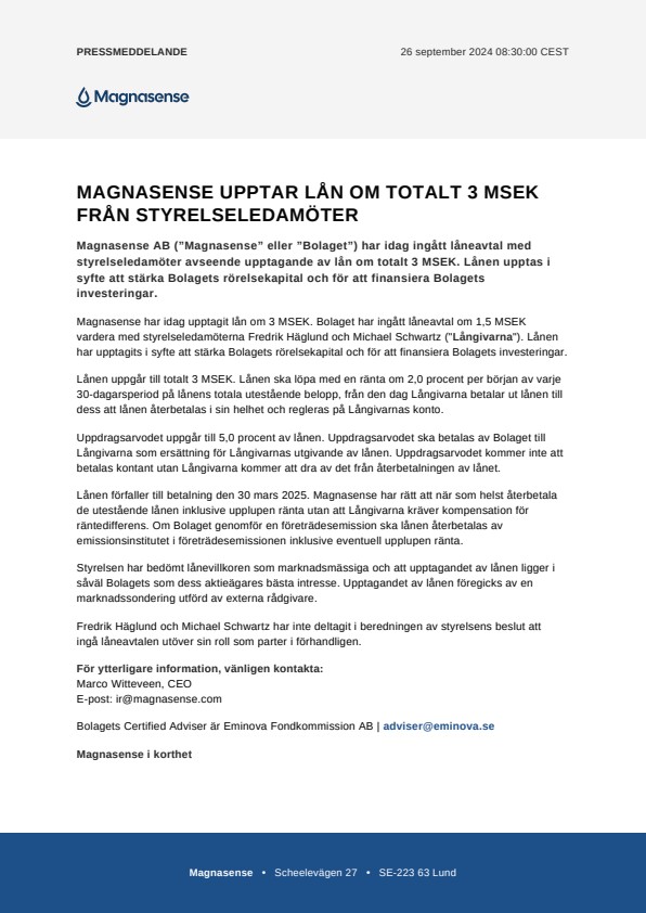 Magnasense AB (”Magnasense” eller ”Bolaget”) har idag ingått låneavtal med styrelseledamöter avseende upptagande av lån om totalt 3 MSEK. Lånen upptas i syfte att stärka Bolagets rörelsekapital och för att finansiera Bolagets investeringar.