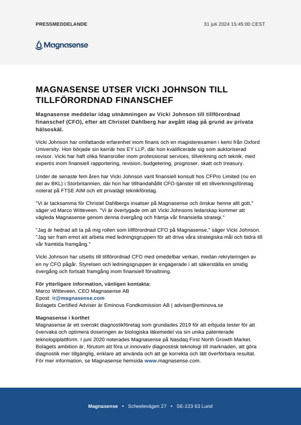 “Vi är tacksamma för Christel Dahlbergs insatser på Magnasense och önskar henne allt gott,” säger vd Marco Witteveen. “Vi är övertygade om att Vicki Johnsons ledarskap kommer att vägleda Magnasense genom denna övergång och främja vår finansiella strategi.”