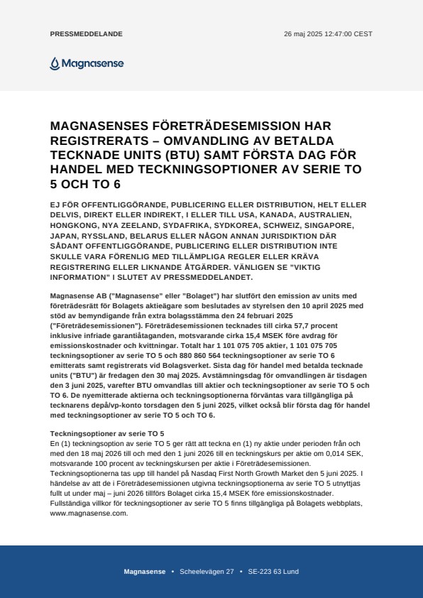 Magnasense AB (”Magnasense” eller ”Bolaget”) har slutfört den emission av units med företrädesrätt för Bolagets aktieägare som beslutades av styrelsen den 10 april 2025 med stöd av bemyndigande från extra bolagsstämma den 24 februari 2025 (“Företrädesemissionen”). Företrädesemissionen tecknades till cirka 57,7 procent inklusive infriade garantiåtaganden, motsvarande cirka 15,4 MSEK före avdrag för emissionskostnader och kvittningar. Totalt har 1 101 075 705 aktier, 1 101 075 705 teckningsoptioner av serie TO 5 och 880 860 564 teckningsoptioner av serie TO 6 emitterats samt registrerats vid Bolagsverket. Sista dag för handel med betalda tecknade units (“BTU”) är fredagen den 30 maj 2025. Avstämningsdag för omvandlingen är tisdagen den 3 juni 2025, varefter BTU omvandlas till aktier och teckningsoptioner av serie TO 5 och TO 6. De nyemitterade aktierna och teckningsoptionerna förväntas vara tillgängliga på tecknarens depå/vp-konto torsdagen den 5 juni 2025, vilket också blir första dag för handel med teckningsoptioner av serie TO 5 och TO 6.