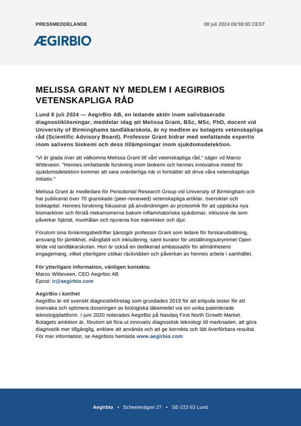Lund 8 juli 2024 — AegirBio AB, en ledande aktör inom salivbaserade diagnostiklösningar, meddelar idag att Melissa Grant, BSc, MSc, PhD, docent vid University of Birminghams tandläkarskola, är ny medlem av bolagets vetenskapliga råd (Scientific Advisory Board). Professor Grant bidrar med omfattande expertis inom salivens biokemi och dess tillämpningar inom sjukdomsdetektion.