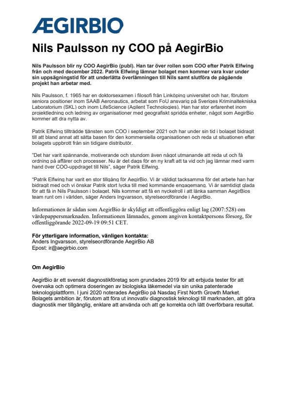 “Patrik Elfwing har varit en stor tillgång för AegirBio. Vi är väldigt tacksamma för det arbete han har bidragit med och vi önskar Patrik stort lycka till med kommande engagemang. Vi är samtidigt glada för att få in Nils Paulsson i bolaget. Nils kommer att få en nyckelroll i att länka samman AegirBios team runt om i världen, säger Anders Ingvarsson, styrelseordförande i AegirBio.
