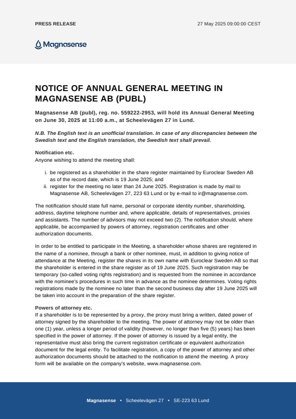 Magnasense AB (publ), reg. no. 559222-2953, will hold its Annual General Meeting on June 30, 2025 at 11:00 a.m., at Scheelevägen 27 in Lund.