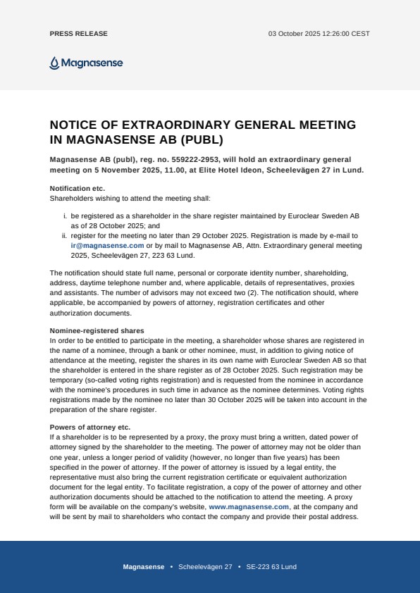 Magnasense AB (publ), reg. no. 559222-2953, will hold an extraordinary general meeting on 5 November 2025, 11.00, at Elite Hotel Ideon, Scheelevägen 27 in Lund.