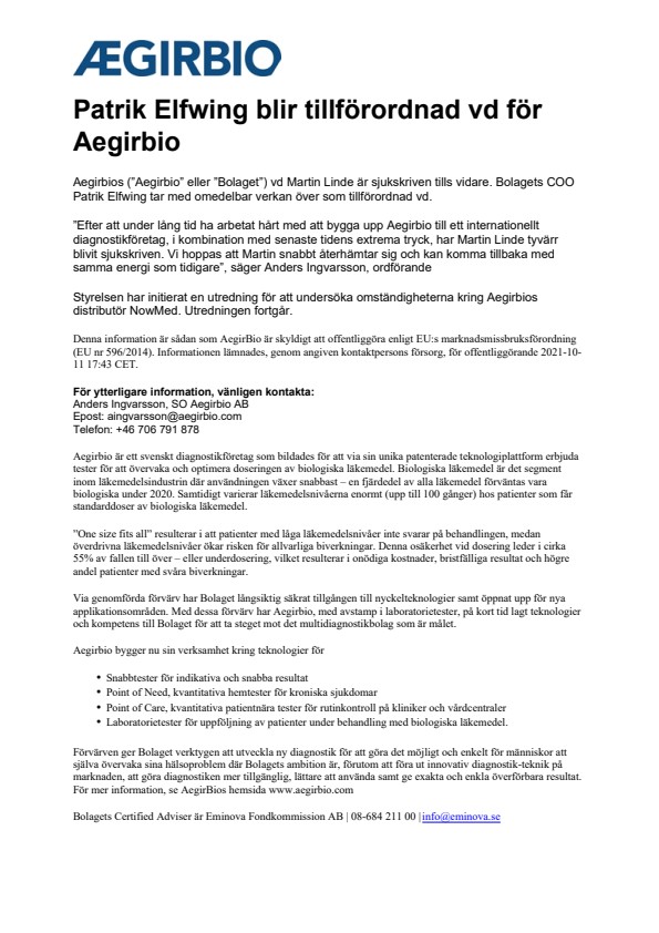 Aegirbios (”Aegirbio” eller ”Bolaget”) vd Martin Linde är sjukskriven tills vidare. Bolagets COO Patrik Elfwing tar med omedelbar verkan över som tillförordnad vd.